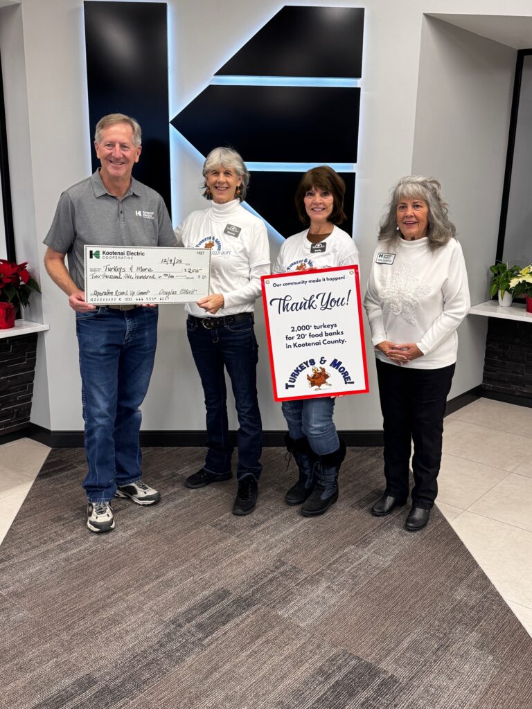 Kootenai Electric Cooperative is shown here giving back to the community in the form of a $2500 check to Turkeys & More. The 7 Trust Board members oversee Operation Roundup Grants awarding $2500 per organization per year. They love how Turkeys & More supports the local community. We appreciate their yearly generosity to support our supplying vulnerable families with turkeys at Thanksgiving.